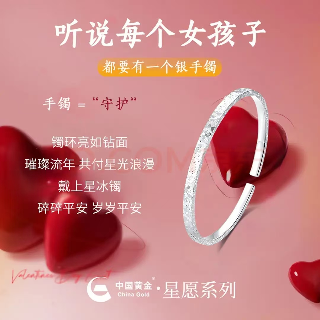 中国黄金(CHINA GOLD)碎冰冰足银999银手镯素圈纯银镯子女生款情人节生日礼物送女朋友 【999足银】碎碎冰手镯+品牌礼盒